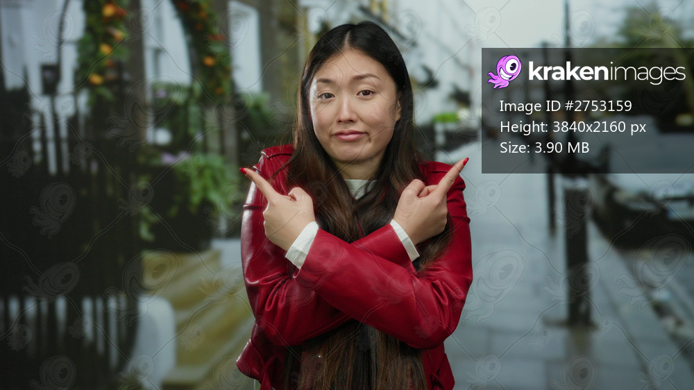 Woman pointing outdoors in urban street wearing red jacket showcasing confident attitude on city road during daytime with trees and buildings in the background. - Kraken Images