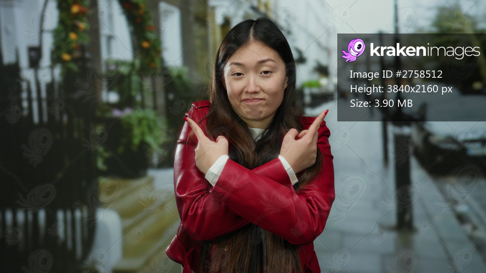 Woman pointing outdoors in urban street wearing red jacket showcasing confident attitude on city road during daytime with trees and buildings in the background. - Kraken Images