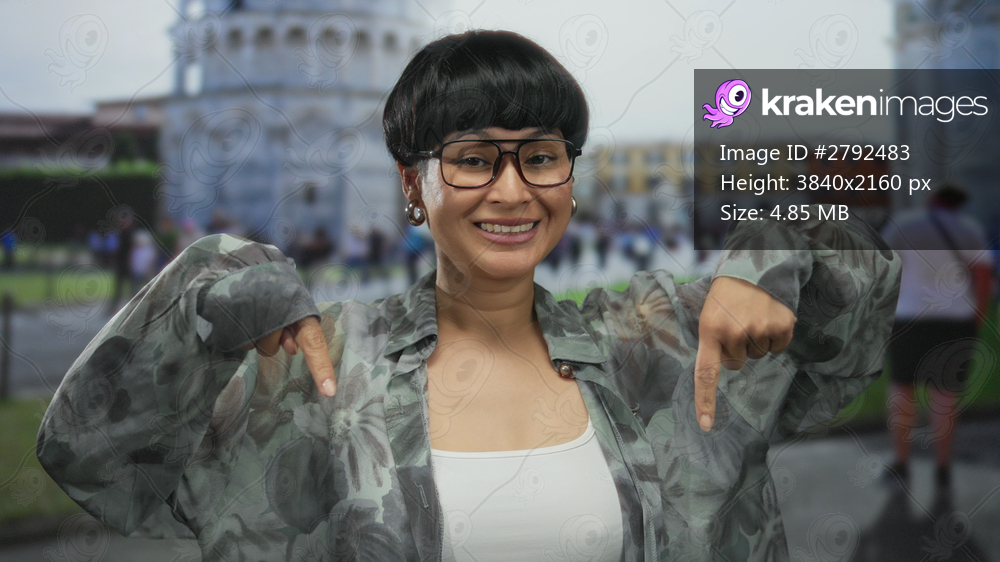 Woman pointing outdoors near pisa tower with glasses and floral blouse, surrounded by tourists in italian cityscape, expressing happiness and curiosity in historic urban setting. - Kraken Images