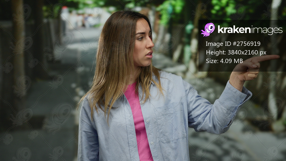 Woman pointing outdoors on a tree-lined street, wearing a casual shirt and looking serious in a urban setting, capturing a moment of focus and direction. - Kraken Images