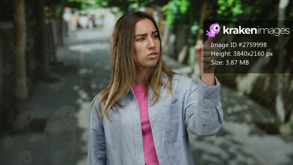 Woman pointing outdoors on a tree-lined street, wearing a casual shirt and looking serious in a urban setting, capturing a moment of focus and direction. - Kraken Images