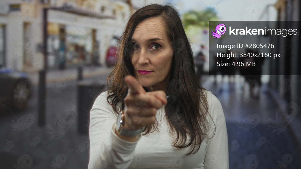 Woman pointing outdoors on an urban street with blurred pedestrians in the background, capturing a confident expression under natural lighting.