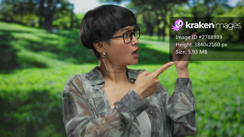 Woman pointing outdoors with surprise, standing in a green park with a calm expression, wearing glasses and casual clothes, showcasing emotion and nature. - Kraken Images