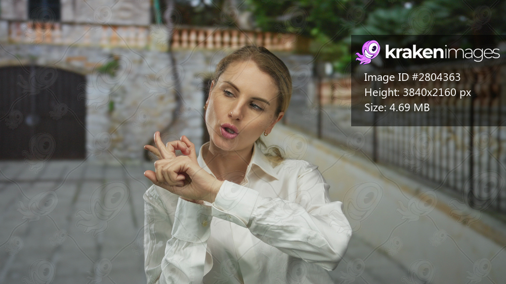 Woman pointing playfully outside in a charming european courtyard features a young blonde woman dressed in a white shirt, set against a picturesque stone wall and iron gate. - Kraken Images