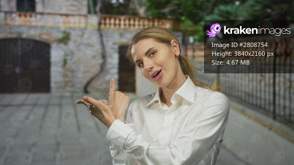 Woman pointing playfully outside in a charming european courtyard features a young blonde woman dressed in a white shirt, set against a picturesque stone wall and iron gate. - Kraken Images
