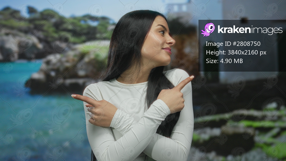 Woman pointing sideways at seaside with a playful expression, highlighting the serene beauty of the ocean backdrop and clear sky.