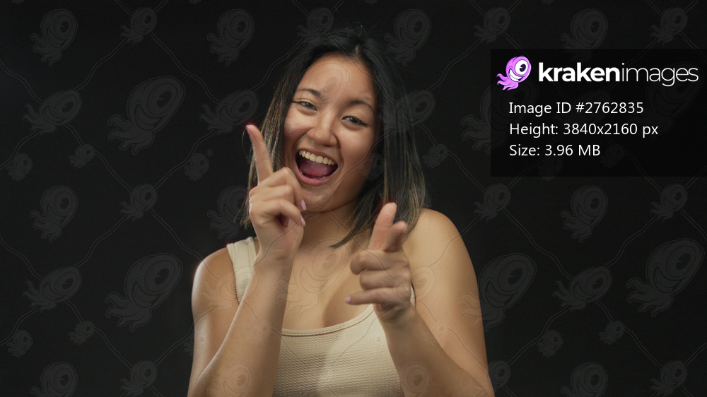 Woman pointing and smiling against a dark background creating a confident and cheerful mood in this studio shot.