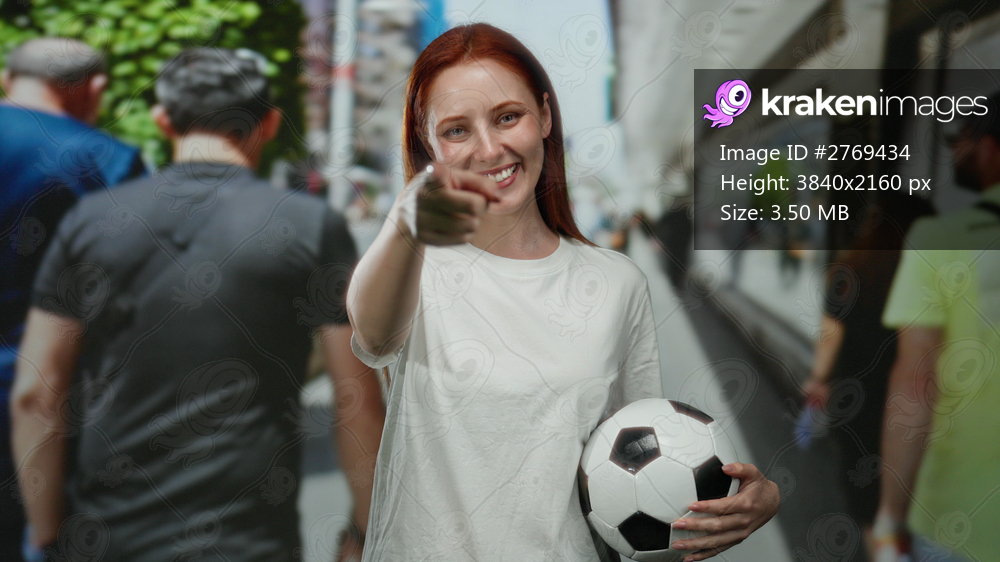 Woman pointing with soccer ball in city street showcasing vibrant outdoor urban setting.