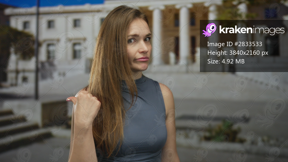 Woman pointing thumb at empty street near a neoclassical building with columns under bright sunlight; indifference.