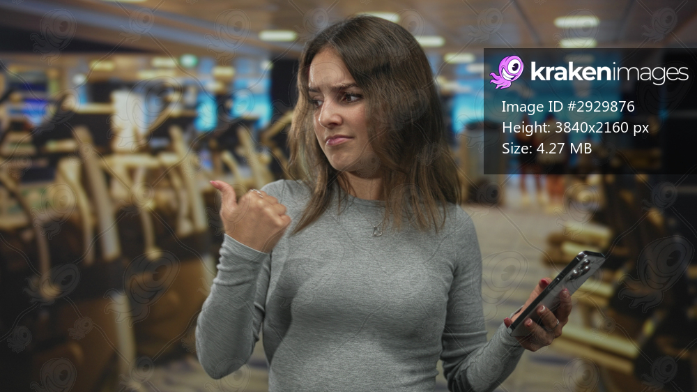 Woman pointing thumb at smartphone in gym near treadmills, wearing gray longsleeve and heart necklace while holding phone; skepticism.