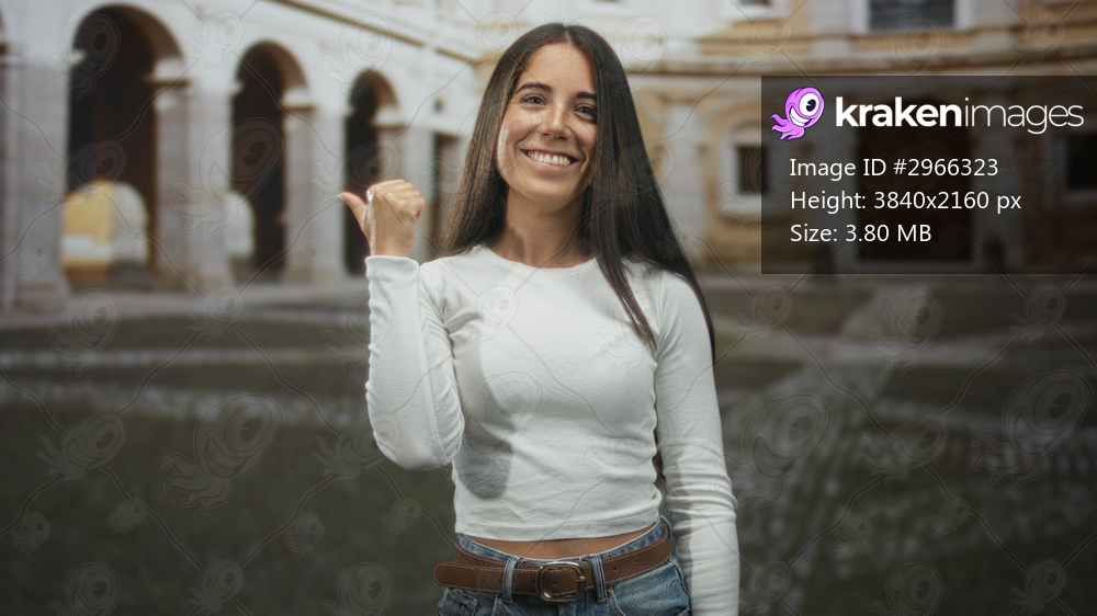 Woman pointing thumb over shoulder at an old building entrance, smiling with visible hand; confidence friendly.