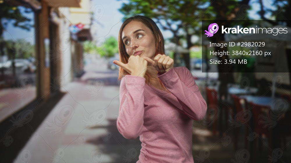 Woman pointing thumb over shoulder with bare thumb and clasped hand visible in a sunlit street cafe; playful confidence.