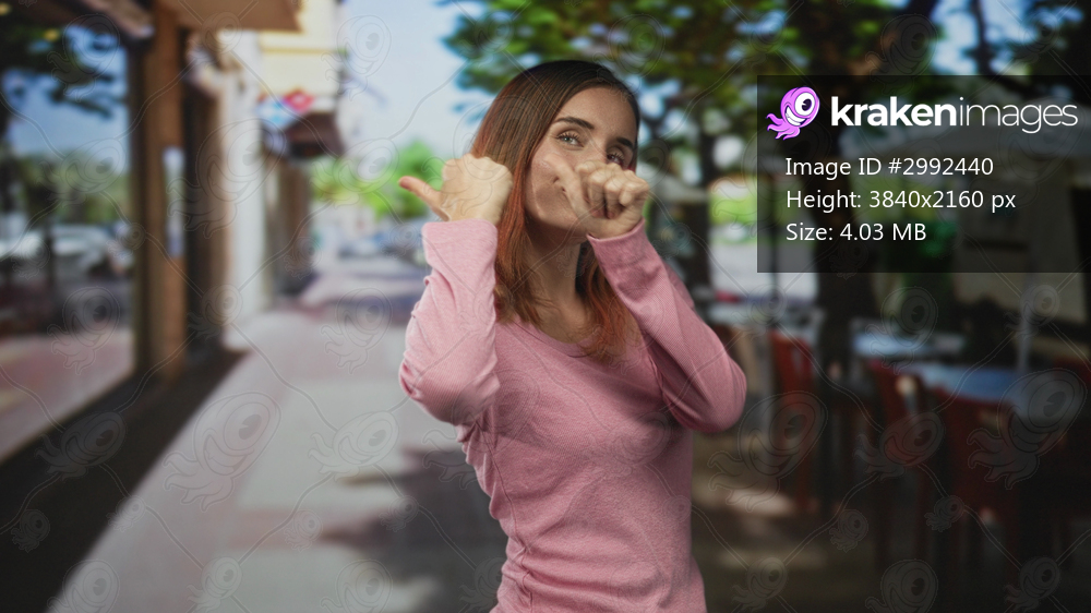 Woman pointing thumb over shoulder with bare thumb and clasped hand visible in a sunlit street cafe; playful confidence.