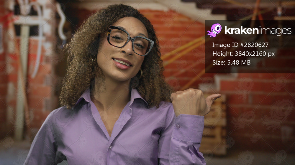 Woman pointing thumb and slightly smiling in building interior with exposed brick walls; confidence.