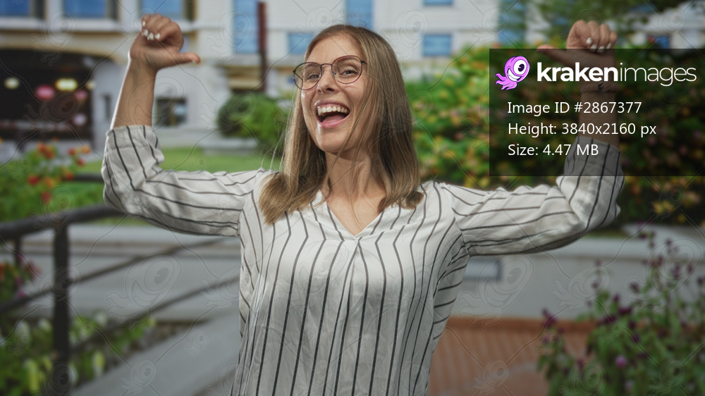 Woman pointing thumb to building facade among garden flowers outdoors with smiling grin and raised arms; confidence.