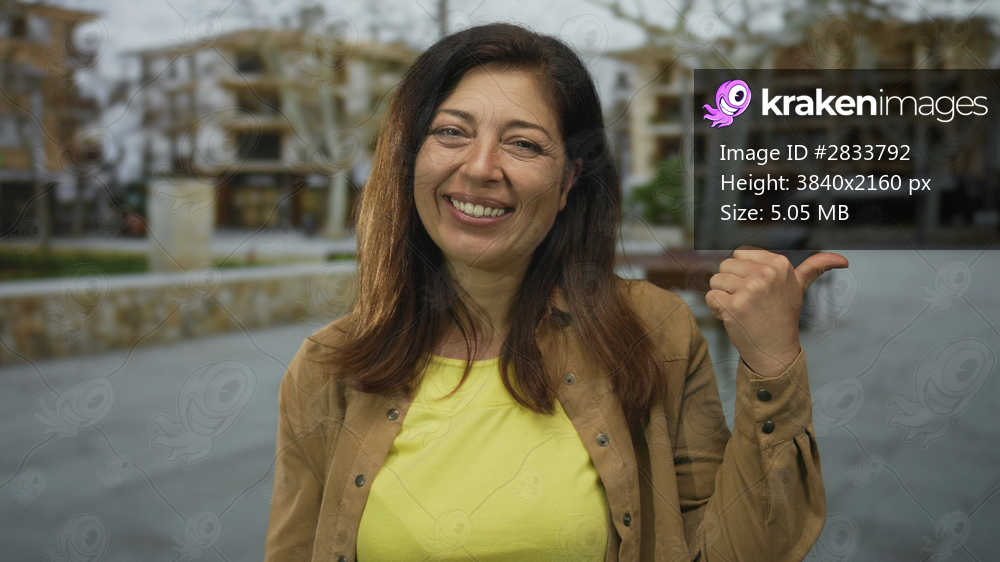 Woman pointing thumb to side on a sunlit urban street with a friendly smile; optimism confidence joy.