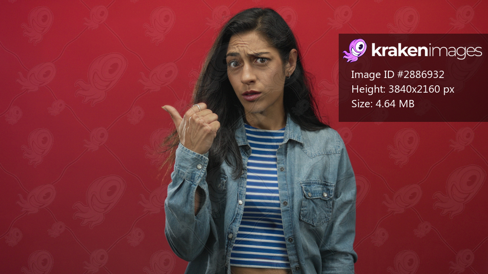 Woman pointing thumb to the side in studio with red wall, wearing blue striped top and denim jacket, furrowed brow and puzzled expression; confusion.