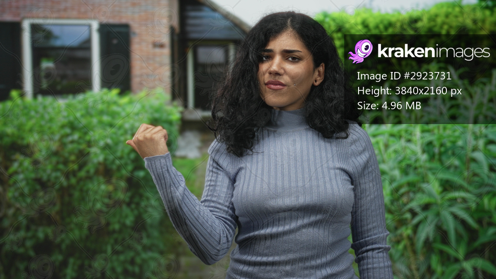 Woman pointing thumb toward building entrance with visible hand and furrowed brow, standing outdoors at a doorway; annoyance.