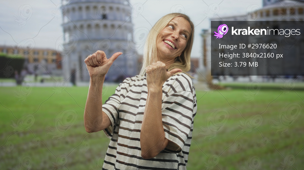 Woman pointing thumbs at chest, smiling and posing by the leaning tower building on green lawn near cathedral; pride travel fun.