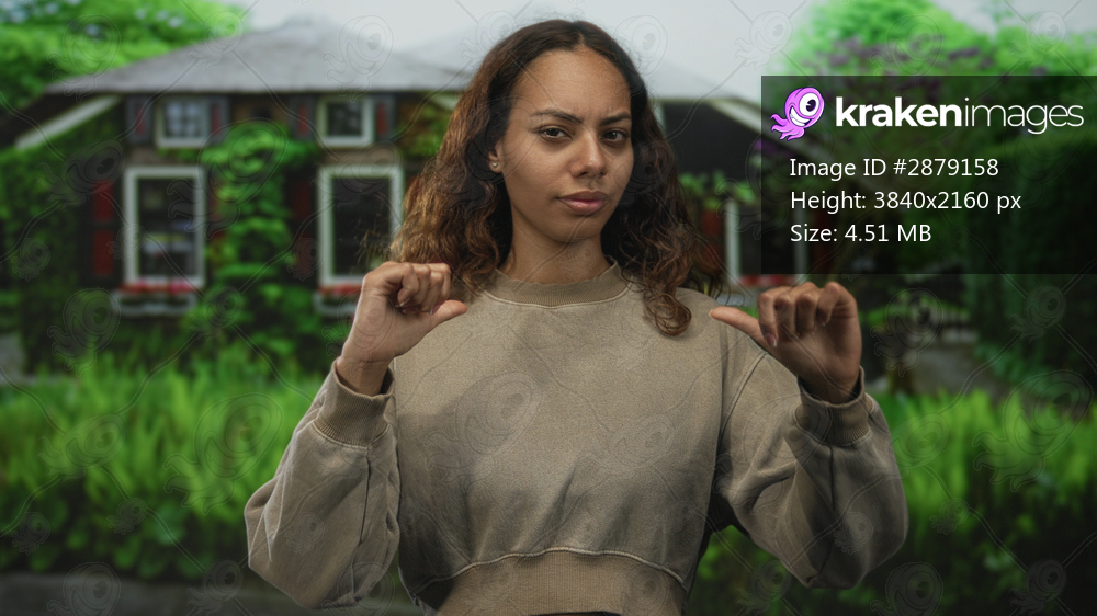 Woman pointing thumbs to chest with a skeptical expression standing before a residential building entrance; confidence.