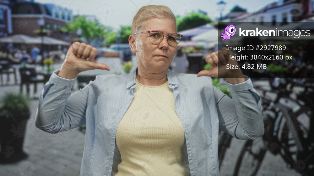 Woman pointing thumbs to chest on a busy amsterdam street with bicycles and outdoor cafe terraces; defiance independence resilience.