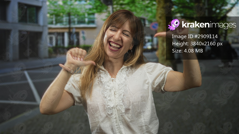 Woman pointing thumbs to chest on a city street wearing white blouse and smiling broadly near trees and buildings in daylight; joy.
