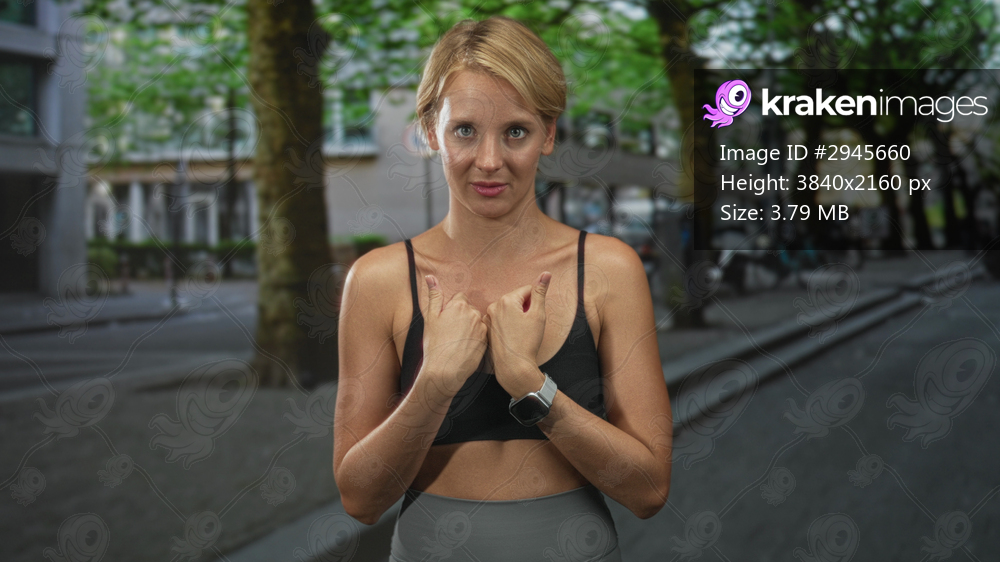 Woman pointing thumbs to chest on street beside trees and building, wearing black sports bra, grey leggings and smartwatch; confidence instruction.