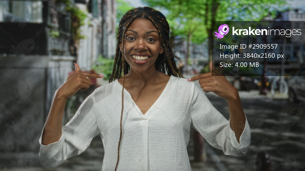 Woman pointing thumbs to chest and shrugging on a city street in white blouse and braided hair; confidence empowerment.