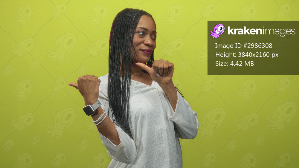 Woman pointing thumbs to self with smartwatch and bracelet visible against green studio backdrop, wearing white blouse and braids; confidence empowerment. - Kraken Images
