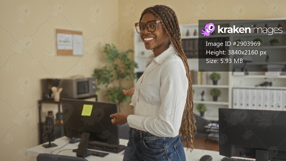 Woman pointing to monitor at office building desk, smiling with long braided hair and glasses, wearing white blouse and jeans; professional confidence. - Kraken Images