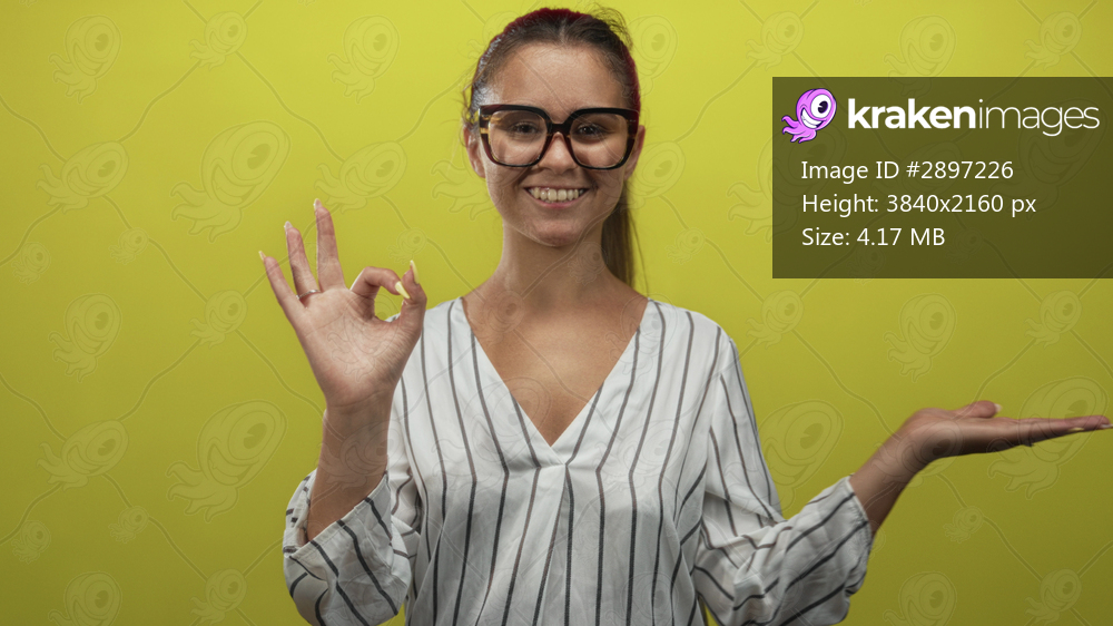 Woman pointing to open palm in studio against yellow backdrop, wearing striped blouse and oversized glasses; friendly invitation.