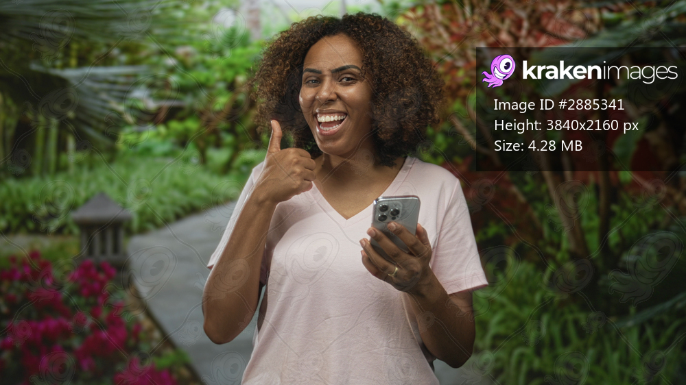 Woman pointing to smartphone on park path smiling and tapping the screen, wearing pink t shirt and gold ring on finger; joy connection.