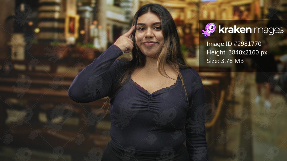 Woman pointing to temple while touching hair and smiling with closed eyes, wearing navy top and nose ring inside building; serenity confidence.