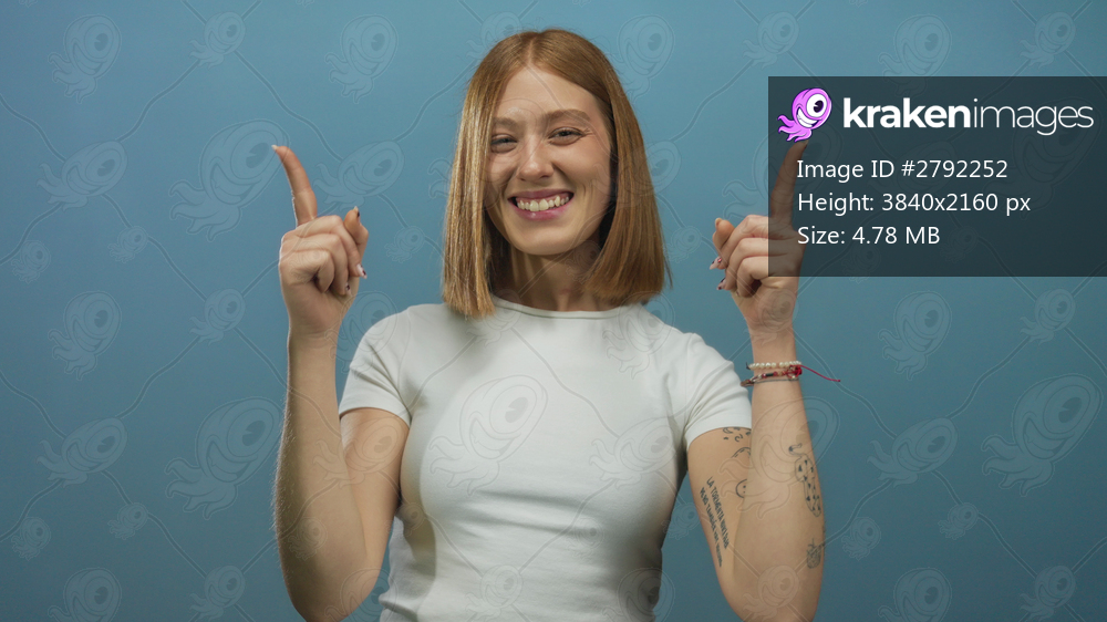 Woman pointing up with both hands, smiling joyfully against a solid blue background, exuding confidence and happiness, perfect for upbeat, positive-themed projects. - Kraken Images