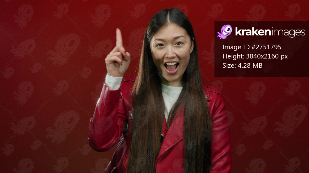 Woman pointing up in red background wearing red jacket smiling confidently suggesting idea asian female isolated red wall attractive adult person