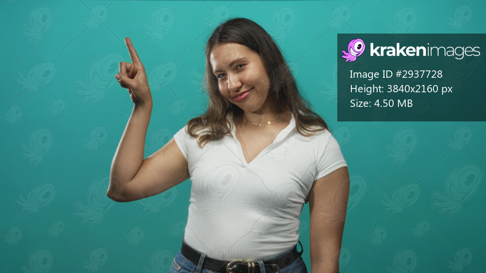 Woman pointing up with index finger and smiling against turquoise studio wall; playful confidence optimism.