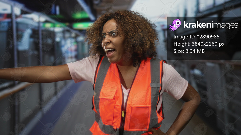 Woman points arm to the side in ship corridor of a building, wearing orange safety vest and gripping lifejacket at waist; safety frustration.