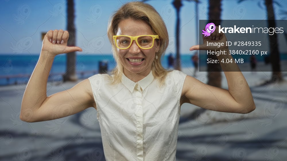 Woman points arms with thumbs at herself wearing yellow glasses and sleeveless blouse on a street by palm trees; confidence.