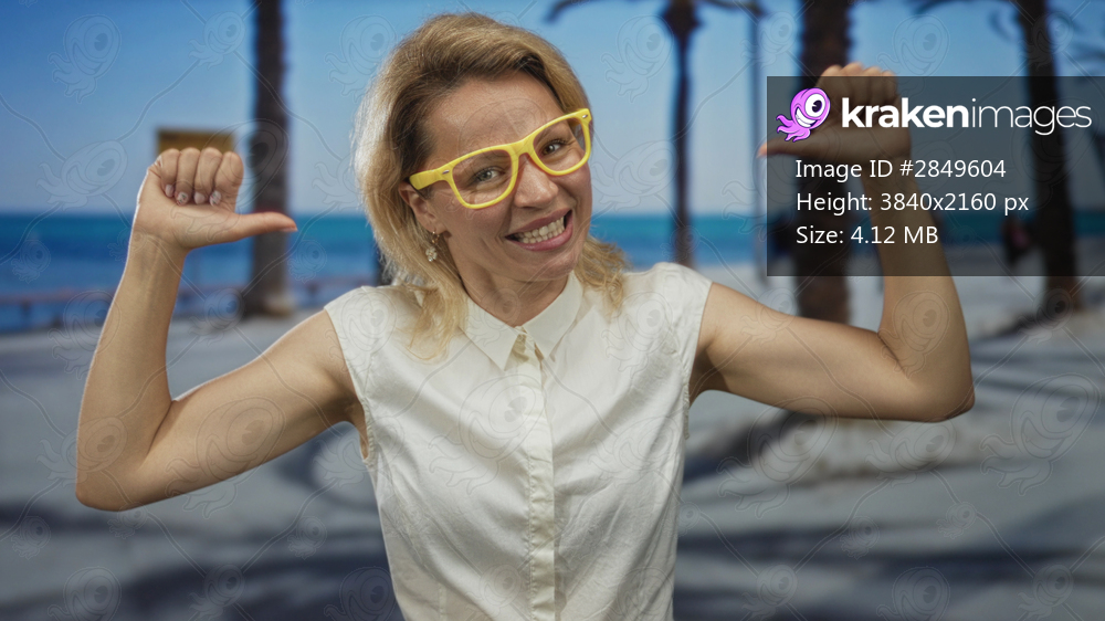 Woman points arms with thumbs at herself wearing yellow glasses and sleeveless blouse on a street by palm trees; confidence.