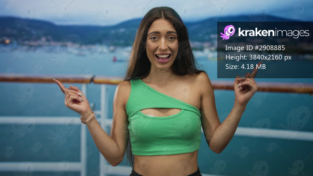 Woman points both fingers on a cruise deck, smiling and showing midriff and bare shoulders in a green crop top against sea; vacation joy.
