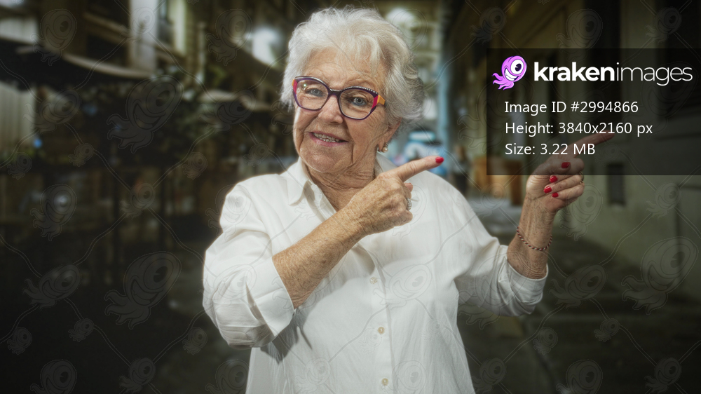 Woman points both fingers to right on narrow street, wearing white shirt, colourful glasses, red nails and bracelet; cheerful welcome.