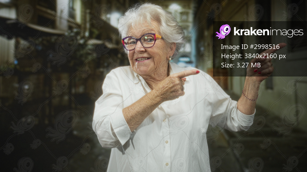 Woman points both fingers to right on narrow street, wearing white shirt, colourful glasses, red nails and bracelet; cheerful welcome.