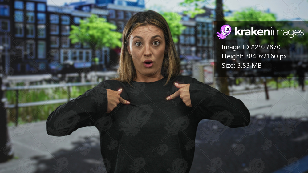 Woman points both fingers to self on street wearing black long sleeve shirt near canal railing and trees; self doubt surprise.