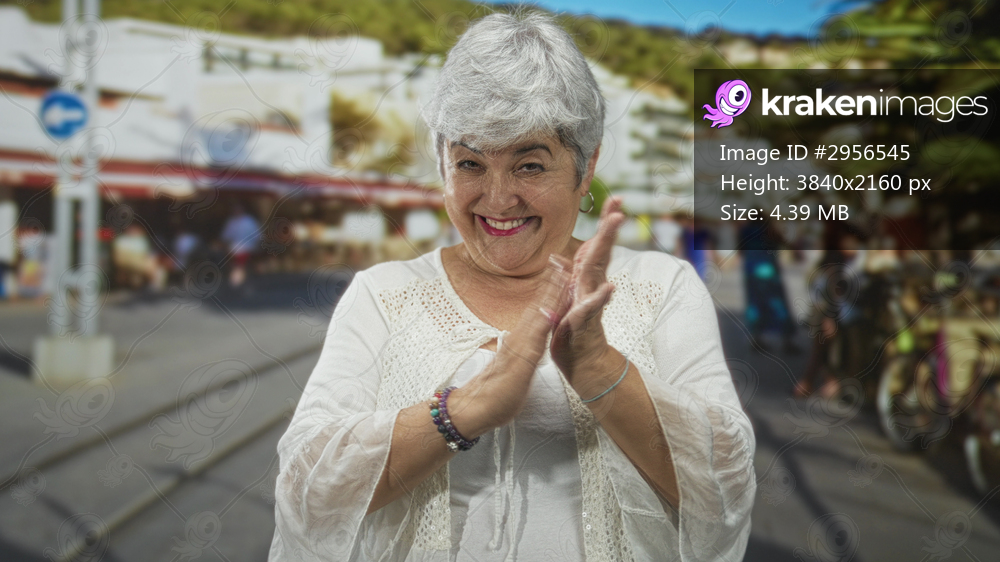 Woman points both fingers toward camera on a crowded street lined with shops and parked bicycles, wearing white blouse and smiling broadly; joyful confidence. - Kraken Images