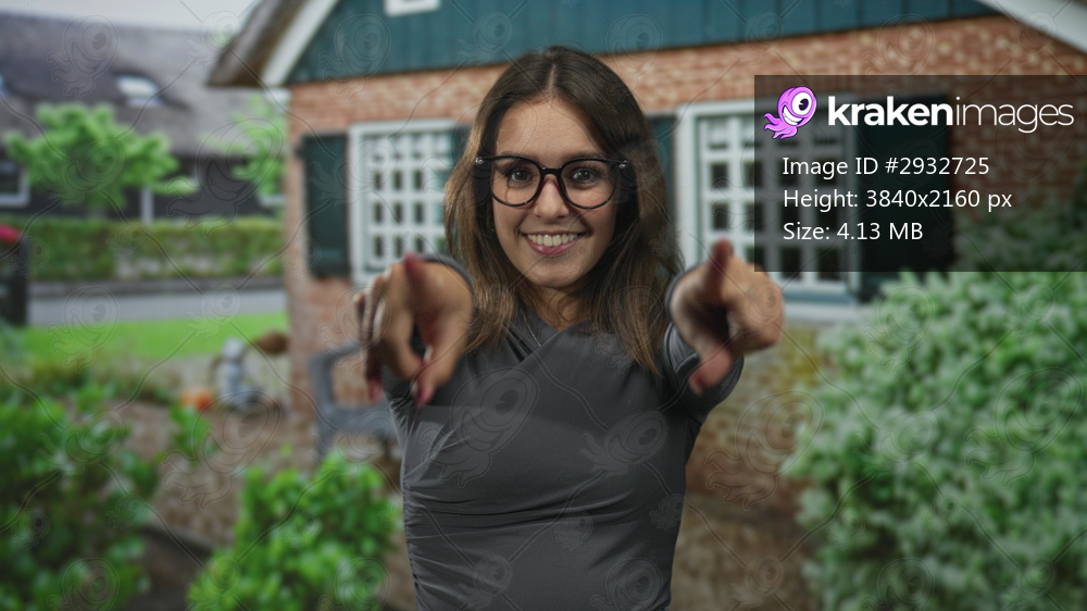 Woman points both hands to camera at building entrance, smiling and wearing glasses; joyful invitation.