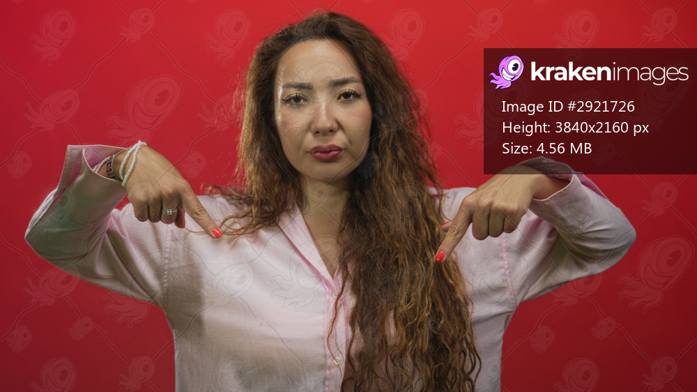 Woman points both index fingers down at long curly hair wearing pink shirt with bracelets in red studio; confidence.