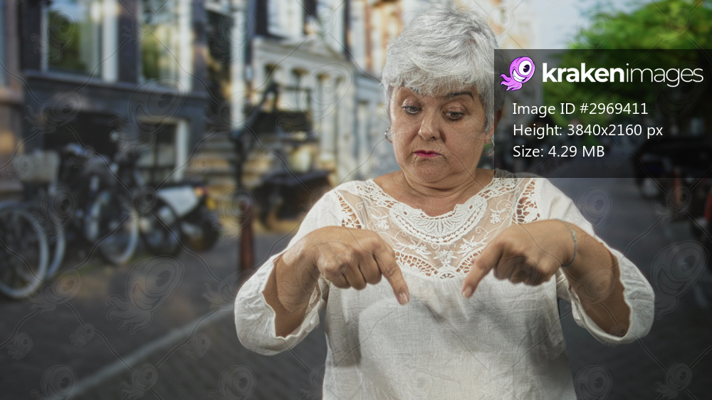 Woman points both index fingers down at pavement on a city street with bicycles, looking stern and insistent; warning frustration.