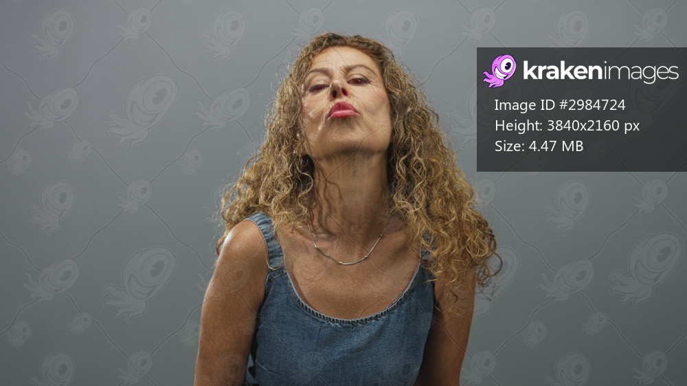 Woman points both index fingers forward in studio while smiling, wearing a denim sleeveless dress with visible rings and curly hair; playful.