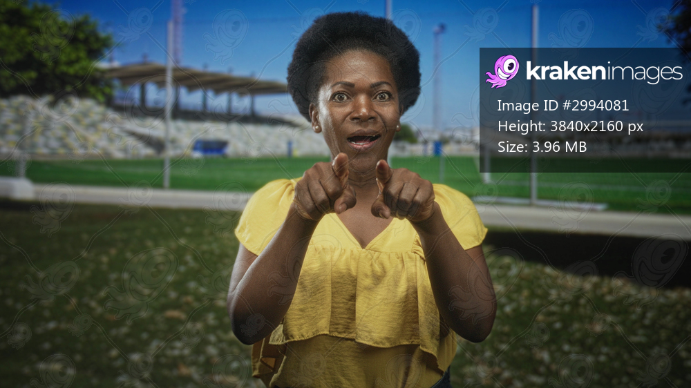 Woman points both index fingers to camera with visible fingers and smiling face, standing before soccer goal and stadium seating in building; confidence challenge. - Kraken Images