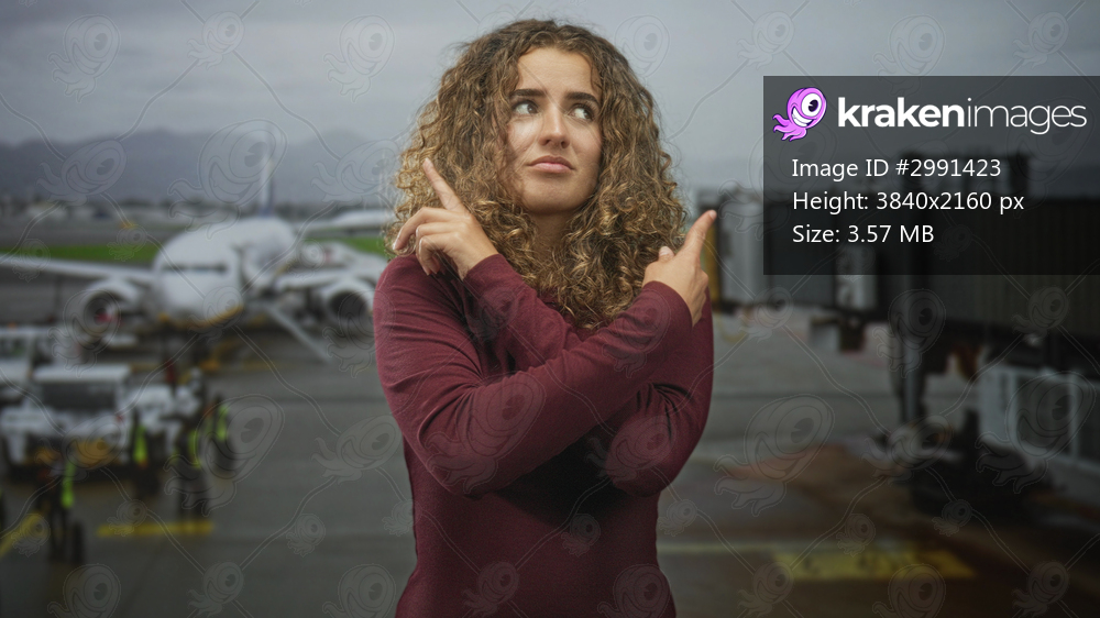 Woman points both index fingers to left and right, crossed arms, pointing toward airplane jetway at airport with a searching glance; uncertain hesitation. - Kraken Images